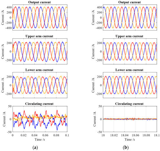 The realization of balancing control is based on controlling the circulating current. The circulating current is calculated by measuring the upper arm and low arm currents. After the balancing achievement, the circulating current is disadvantageous in terms of the arm current quality and power losses, which are required to be eliminated. Figure 11 presents the simulated output current, arm current, and circulating current. From Figure 11a, it is shown that the circulating current reaches 40 A, and the waveforms of the output current and the current in the upper arm and lower arm yield some distortions at the start of the operation. As shown in Figure 11b, the circulating current is eliminated, and the output current and arm current are less distorted in a balanced situation.