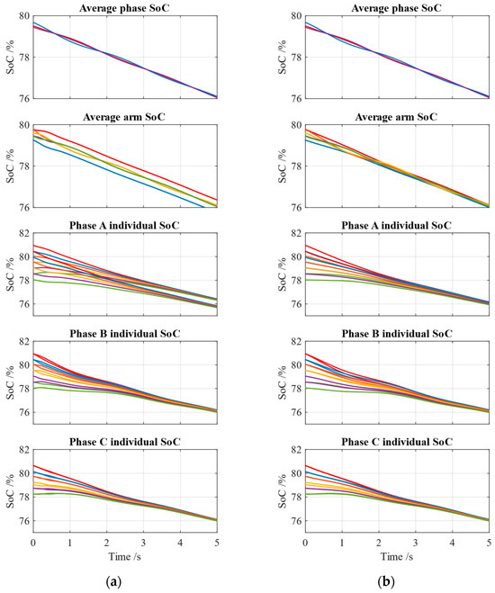 To compare the control performance of the HASBC and the SASBC, the SoC profiles under the two control methods are shown separately in Figure 13a,b in terms of phase SoC, arm SoC, and individual SoC. It is noted that the arm SoC profiles with the HASBC cannot be converged to a line, and the individual SoC profiles of phase A split as two bundles, even though the individual SoC profiles of phase B and phase C are well equalized. In contrast, the arm SoC profiles with the SASBC tend to be equal, and the individual SoC profiles of phase A, phase B, and phase C are all well balanced. The SoC profiles are shown in 5 s for the sake of a clear illustration, and more information is shown in Figure 14.