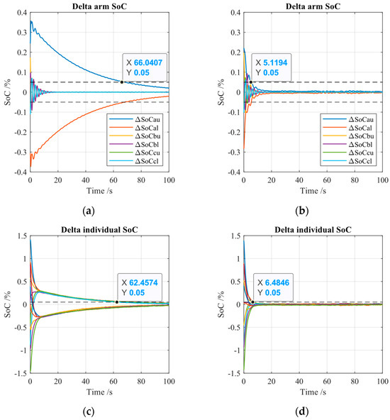 Figure 14a,b track the value of the difference/delta between the arm SoCs and their average SoC under the regulation of the hard and soft SoC balancing controls. As shown in Figure 14a, under HASBC, even though the delta arm SoCs in phase B and phase C can be fast-forced to zero, i.e., equalized arm SoCs, the arm SoCs of the phase A upper arm and lower arm are not able to follow the average arm SoC before 100 s, and it takes 66 s in the phase A upper arm to reduce the delta SoC to 0.05% () with reference to the average arm SoC. In contrast, as shown in Figure 14b, all arm SoCs in the three phases/six arms can be balanced fast, and it takes 5.1 s to fall into the 0.05% zone under the SASBC. Figure 14c,d depict the SoC gap (delta individual SoC calculated by Equation (43)) in phase A under the two control modes. It is obvious that the delta individual SoCs under the HASBC are split into two groups and converge slowly (>100 s) toward zero, taking up to 62.5 s to enter the threshold of 0.05% deviation. However, they are forced to converge at zero rapidly and only take 6.5 s to reach the margin of 0.05% under the SASBC. To summarize, the SoC comparison between the HASBC and SASBC is listed in Table 2 based on Figure 13 and Figure 14.