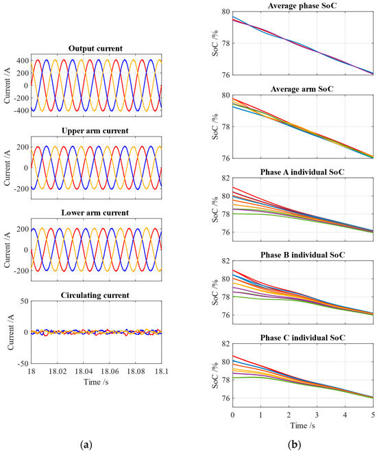 Considering the robustness of the MMC-BESS, which encompasses numerous submodules and components, evaluating its robustness in response to component variations becomes essential. Consequently, a simulation is conducted for the MMC-BESS, integrating variations in submodule capacitances and arm inductance. The capacitance of the submodule and the inductance of the arm inductor, respectively, exhibit random variations of ±10% around the nominal values. The simulation results, as shown in Figure 16, reveal that the output current, upper and lower arm current, and SoC profiles show little difference from those of the simulation without component variations. Additionally, the circulating current is noticeably higher but acceptable (<2% output current) compared to simulations without these variations. The robustness test shows the control system’s effective performance in handling component variations.