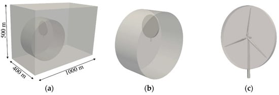 For the purpose of mesh quality enhancement and computational resource optimization, a poly-hexcore mesh was generated using Fluent meshing in this study. The polyhedral mesh optimizes the mesh quality near the wall, and the hexahedral mesh in the region away from the wall enhances the orthogonality of the mesh, thereby increasing the mesh quality. The computational domain dimensions were defined as 1000 m, 400 m, and 500 m in the x-, y-, and z-directions, respectively, corresponding to the incoming flow direction, horizontal direction, and gravity direction. Grid diagrams for these directions are presented in Figure 3. A total of 3.43 million grids were created in this simulation. Six boundary layers were generated near the blade, and the minimum boundary layer size was 0.004 m. A refined mesh was used behind the rotor to accurately simulate the vortices, with a minimum refinement size of 0.5 m.