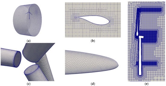Mesh for the simulation: (a) mesh of pitch AMI; (b) mesh of boundary layer; (c) mesh of blade root; (d) mesh of blade tip; (e) refinement zone.