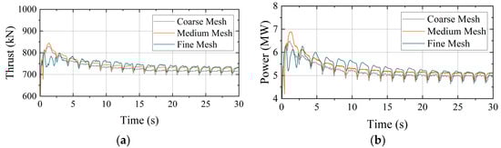 Mesh convergence analysis of (a) thrust and (b) power.