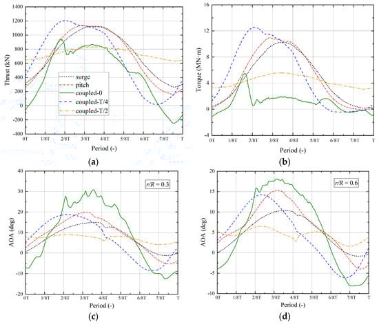 - Different platform movements cause different rotor motion velocities, which affect the aerodynamic characteristics of the wind turbine, such as thrust, torque, and AOA. When the wind turbine is affected by the in-phase surge–pitch motion, the rotor load fluctuation amplitude is the largest, even resulting in negative thrust and torque. The amplitude of the wind turbine load change also decreases with the lag of the surge motion. When the surge motion lags by T/2, the amplitude of wind turbine load change is the smallest due to the counteracting effect between the surge and the pitch motion.