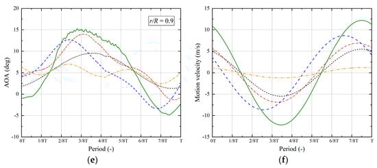 AOA variations at different blade cross-sections displayed consistent trends across various operational conditions. It is noteworthy that, with increasing blade radius, the amplitude of AOA variation gradually diminished. At the blade radius of 0.3 r, when subjected to surge motion, the maximum and minimum AOA values were measured at 14.86° and −1.23°, respectively. In the case of pitch motion alone, the maximum and minimum AOA values were observed to be 19.94° and −5.29°, respectively. In the context of in-phase coupled surge–pitch motion, the maximum and minimum AOA values reached 30.85° and −12.46°, respectively. As the surge motion lagged by T/4, the maximum and minimum AOA values were registered as 18.76° and −8.43°, respectively. When surge motion lagged by T/2, the maximum and minimum AOA values were found to be 9.06° and 4.09°, respectively.