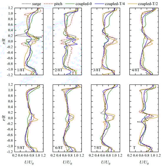 The near wake field of a wind turbine may manifest diverse characteristics in response to different platform motions. The velocity field within this wake is a pivotal aspect that is indispensable for investigating variations in the wake itself. The presence of complex platform motions can give rise to intricate alterations in the wake field, potentially amplifying turbulence intensity and exerting an influence on wake recovery. Figure 6 illustrates modifications in the velocity field of the rotor wake at the 1 R position, situated behind the rotor, during various moments influenced by different platform motions. “r” represents the distance from the rotor center to the velocity measurement point, “R” denotes the rotor radius, and “U0” signifies the free-stream velocity maintained at 11.4 m/s. Typically, the velocity deficit within the wake field remains around 0.6 at any specific moment, with the wake center exhibiting a minimal velocity deficit. Exclusively influenced by surge motion, the velocity deficit at the center of the wake demonstrates noteworthy variations at the 1/8T moment. The minimum velocity deficit recorded is 0.24, while the maximum velocity deficit reaches 1.14. This observation implies that, during this specific moment, the velocity at the wake center exceeds the free stream velocity. Under the exclusive influence of pitch motion, the minimum velocity deficit at the wake center is 0.43, and the maximum velocity deficit is 0.98. When subjected to in-phase coupled surge–pitch motion, the velocity deficit undergoes substantial variations within the wake center region, featuring slightly elevated deficits on the upper half of the curve compared to other conditions. Notably, as surge motion lags, the fluctuations in velocity deficit across the entire wake region gradually diminish. During the 4/8T–6/8T moments, the wake velocity distribution remains relatively consistent across all conditions; however, at the 7/8T–1T moment, significant disparities in wake velocity distribution emerge among different conditions. As a conclusion, the wind turbine wake sustains a velocity deficit of approximately 0.6 under the influence of relatively minor platform motions. In the wake center region, the velocity deficit is maintained at approximately 0.9–1.0. Nevertheless, as wind turbine platform motions become more intricate, the wake undergoes intricate changes, characterized by pronounced fluctuations in wake center velocity during specific moments. This phenomenon can result in substantial velocity deficits, or even velocities surpassing the free-stream velocity.
