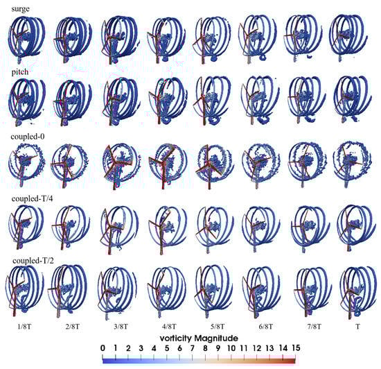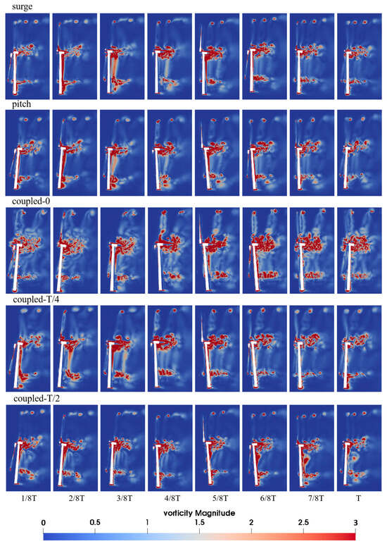 Figure 7 illustrates the unsteady flow field behind the wind turbine rotor and tower during various platform movements. It is noteworthy that there were distinct tip vortices present behind the blade tip, while a multitude of intricate vortices congregated behind the nacelle. The continuity of the tip vortex is easily disrupted due to vortex shedding from the tower, leading to the fragmentation of the tip vortex behind the tower. The vortex within the wind turbine wake appears to be similar under the influence of either surge motion or pitch motion alone. During forward motion of the wind turbine, the separation between blade tip vortices widens, whereas backward motion results in a reduction in this gap, with the possibility of vortices intersecting. Under the influence of pitch motion at 4/8T, the interaction between the two tip vortices became apparent. When the wind turbine underwent in-phase coupled surge–pitch motion, the wake state exhibited pronounced instability, manifesting in the formation of a multitude of intricate vortices at the center of the rotor and behind the tower. During forward motion, a substantial gap existed between the two blade tip vortices, while backward motion led to a heightened interaction between the new blade tip vortex and the preceding one. Additionally, there were vortices with lower strength dispersed in other regions behind the rotor. As the platform’s surge motion lagged, there was a gradual reduction in wake intensity, accompanied by a gradual clarification of the tip vortex structure.