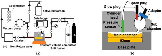 The diagram illustrating the experimental setup is shown in Figure 1a [13]. An ammonia cylinder and an oxygen cylinder were connected to an isochoric chamber. A pressure gauge (GC04, Nagano Keiki Co., Ltd., Tokyo, Japan) was installed on the connecting pipe between the cylinders and the combustor to measure the induced pressure inside the constant volume. These measurements were transmitted to a data logger (DS1202Z, RIGOL Technologies, Suzhou, China) for recording and further analyses purposes. A catalyst was used for exhaust gas purification, where a cooling system was placed between the vacuum pump and the catalyst. Additionally, a pipe was used to connect the outlet side of the vacuum pump to the upstream side of the catalyst, allowing the circulation of exhaust gas to pass through the vacuum pump for effective refinement. The constant-volume burner used in the experiment is illustrated in Figure 1b [13], showing a cross-sectional schematic diagram. Within the engine head, a pre-combustion chamber originally designed for the diesel engine (TF120V-E, Yanmar Holdings Co., Ltd., Osaka, Japan) was modified for the experiment. The engine underwent modifications by replacing the injector with a spark plug (NGK-CR8E, Niterra Co., Ltd., Nagoya, Japan) connected to the engine head using a specific connector in the sub-cavity. The yellow component represents the lower surface of the main chamber, a simplified depiction based on a flat piston with a 92 mm diameter. The absolute volume was approximately 425 × 103 mm3, comprising a 235 × 103 mm3 sub-chamber and a 19 × 103 mm3 main chamber interconnected by a cylindrical channel with a cross-sectional area of 526 × 102 mm2. Initially, the pre-chamber was heated using a glow plug to enhance the combustion process, and oxygen was introduced into the pre-chamber through a pipeline. In the subsequent stage, a mixture of ammonia and oxygen was supplied to the constant-volume combustion chamber (CVCC) and ignited using a spark plug installed inside the pre-chamber. Finally, the exhaust gas passed through the oxidation catalyst, undergoing thorough decomposition before being released into the surrounding atmosphere.