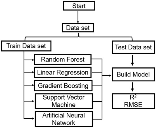 In the second step of the analysis, various machine algorithms were used to identify the best algorithm that had the lower RMSE and the highest R2 values. Therefore, a total of five different algorithms, Random Forest, Gradient Boosting, Support Vector Machine, Linear Regression, and ANN algorithms, were utilized and compared between each other.