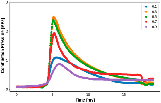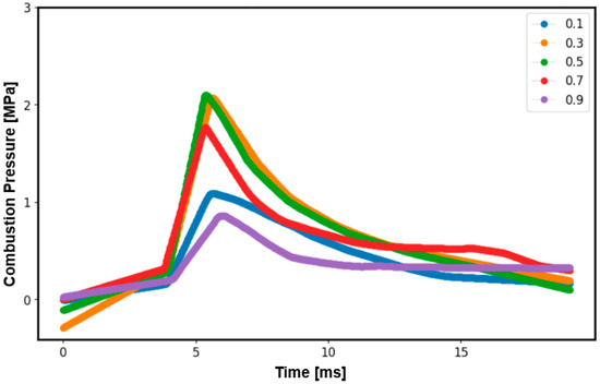 Therefore, the authors considered equivalence ratios from 0.1 to 1.0 not only for the experimental values but also for predicted values. The reason behind this is the reduced quantity of ammonia as fuel with an equivalence ratio of 0.2, resulting in a weakened combustion pressure. Furthermore, even at an equivalence ratio of 1, there was a reduction in the maximum combustion pressure, indicating enhanced combustion efficiency in scenarios where the oxygen content was higher. Figure 5 illustrates the relationship between pressure and time at various equivalence ratios for the machine learning algorithm without the ANN. Similarly, Figure 6 shows the relationship between induced pressure and time at various equivalence ratios for the ANN algorithm. Comparing Figure 5 and Figure 6, it is clear that the machine learning algorithm without the ANN had a better fit compared to the experiment (Figure 4).