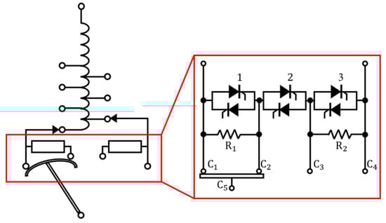 The RC snubber circuits are connected in parallel to ensure minimum voltage surge in switching elements when changing taps. The equivalent circuit of the tap-changing transformer is shown in