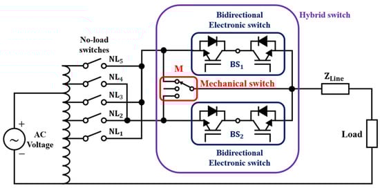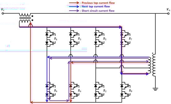 21]. However, it increases switching stress and losses in bidirectional commutation. In addition, a short circuit may occur during instantaneous tap hard changing. The turn-on/off overlap switching between switches during tap changes is applied in an SVR [