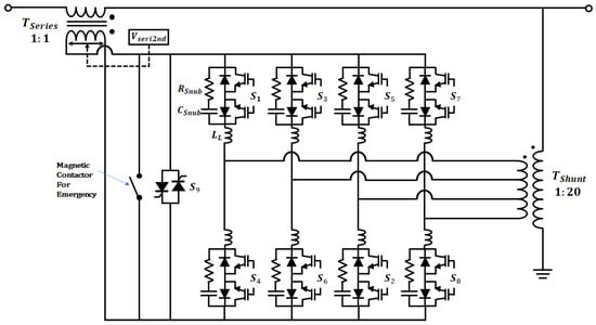 There are nine switches (), and switching operations occur when the tap is changed. Among the nine switches, numbers are bidirectional IGBT switches which perform switching operations when tap changing. Once the compensation voltage is determined, two of the eight switches are selected and fired. There are total of 13 voltage levels that can be controlled through the fired switch and the secondary winding of the parallel transformer. serves as a bypass circuit and uses a relatively high rated thyristor. This is used as a protection circuit for the IGBT in the event of ISVR internal failure or a distribution line accident.