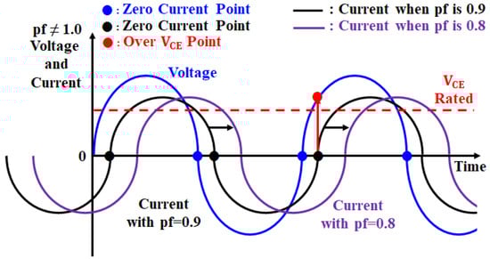 In zero-point switching, there are usually two methods: zero-current switching and zero-voltage switching. First, zero-current switching is based on the amplitude and direction of the current. If the current direction changes between tap changes, a short circuit may occur. In addition, IGBTs can operate stably only when a switching signal is applied within a certain collector–emitter voltage range. However, most of the loads on distribution lines are inductive, which have a lagging power factor as shown in