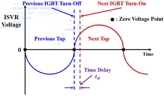 Figure 12, owing to the IGBT characteristics and system clock time before switching to the next tap. If a tap is switched without considering the delay time and the IGBT corresponding to the next tap is fired, the parallel transformer and the IGBT form a short circuit, causing a large short-circuit current. In addition, the current temporarily flows into the snubber circuit of the switch during the delay time. If it is set too long, the series transformer may be open and the voltage across the series transformer becomes near to the system voltage 1.0 p.u. Therefore, zero-voltage switching through accurate zero-point detection is indispensable.