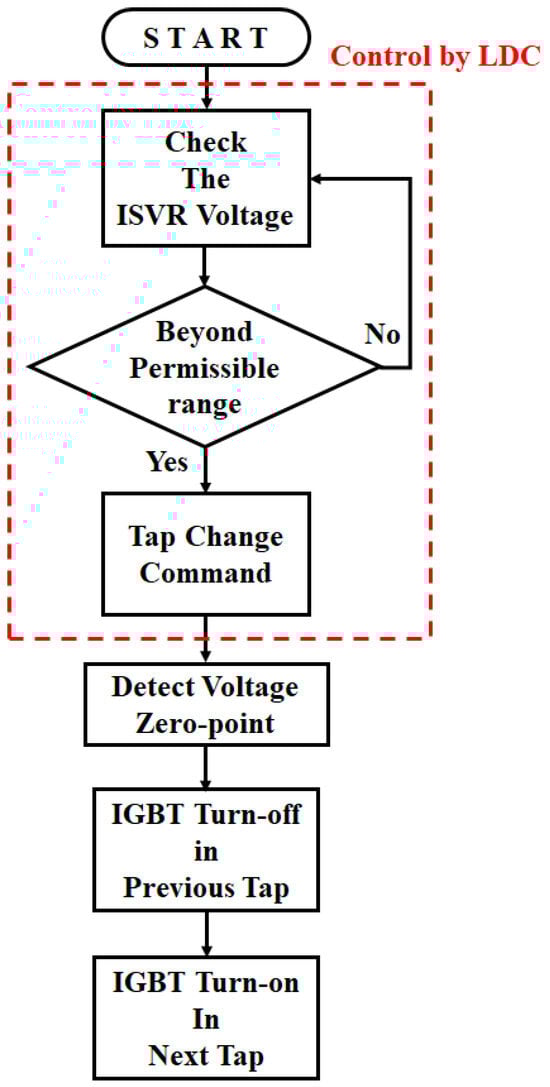 Figure 14. If the line voltage is monitored and beyond a permissible voltage range, the tap-changing command is directed to the ISVR by the LDC. Then, tap change switching is performed at the nearest voltage zero-point just after a tap change command is directed to the ISVR.