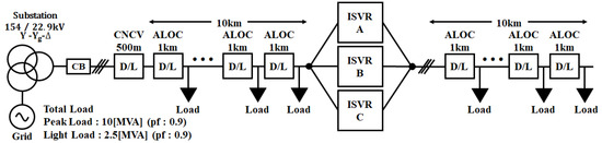 consists of 20 km. The distribution line was divided into 20 sections and a 0.5 MVA load was connected every 1 km. The total load of the distribution line is an inductive load of 10 MVA at a heavy load and 2.5 MVA at a light load, and both have a load power factor of 0.9. The components and parameters of the model distribution systems are as shown in