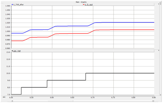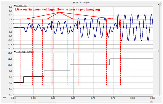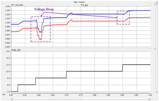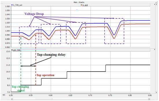 Figure 17. The horizontal axis represents the tap-switching time as seconds, and the vertical axis represents the voltage p.u. based on 22.9 kV. The blue line is the voltage just after the SVR, and the red line represents the voltage at the end of the line. It is known that large voltage drops occur due to the current-limiting resistance when changing tap. This voltage drop occurs while passing through the current-limiting resistor after the tap change signal is applied, that is, during the tap-changing delay.
