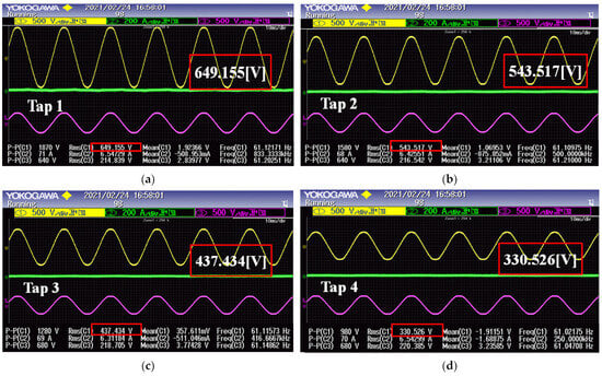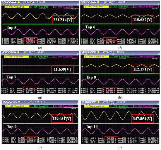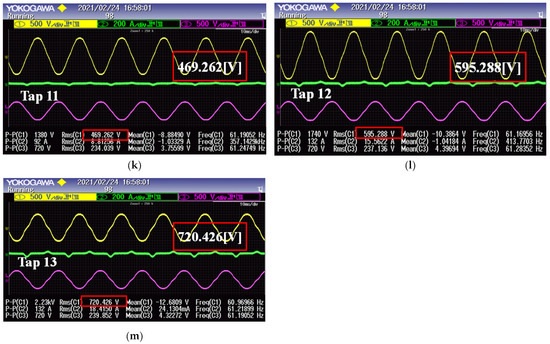 Figure 24h–m show the case where the effective value voltage compensated for in the series transformer is 110 ~ 660 V, but the actual compensated voltage values are 112.191 V, 229.031 V, 347.854 V, 469.262 V, 595.288 V, and 720.426 V. It is confirmed that generally good voltage compensation was achieved.