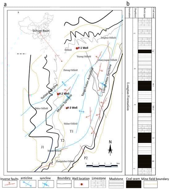 The coal-bearing strata in the study area belong to the Upper Permian Longtan Formation, which is a transitional zone between marine and terrestrial deposits. The thickness of the coal-bearing strata ranges from 66 to 80 m, with an average thickness of 74 m. The lithology of the strata in the study area consists of gray to dark gray mudstone, sandy mudstone, siltstone, and minor amounts of fine sandstone, mudstone, limestone, and alumina mudstone. There are 10 to 12 coal seams in the strata, with two seams being economically viable and locally viable. The M6-3 and M12 coal seams are locally viable, while the M7 and M8 coal seams are economically viable throughout the entire area (Figure 1b).