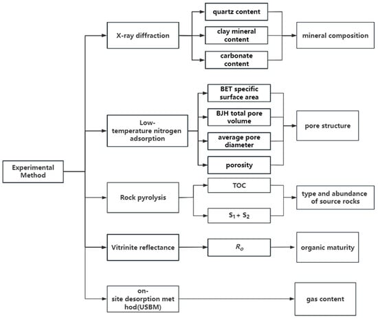 The experimental procedures in this study, as depicted in Figure 2, were conducted to gain insights into the reservoir properties. XRD analysis was employed to determine the mineral composition, focusing on quartz, clay minerals, and carbonate content. These measurements are crucial for understanding the reservoir characteristics. Rock pyrolysis experiments were performed to identify the type and abundance of organic matter using TOC and hydrocarbon generation potential (S1 + S2) parameters. This information helps assess the potential for hydrocarbon generation. Vitrinite reflectance experiments provided data on organic maturity, aiding in understanding the thermal history of the reservoir and estimating the timing of hydrocarbon generation. Low-temperature nitrogen adsorption experiments were conducted to characterize the pore structure of the material. Parameters such as pore volume, diameter, and porosity were determined. Pore volume analysis helps understand its storage capacity. Pore size distribution analysis yields information on pore diameter and contributes to assessing permeability and selectivity. Porosity evaluation, indicating the fraction of void space, aids in understanding transport properties. These experiments and subsequent analysis offer a comprehensive understanding of the material’s pore structure. Such knowledge is crucial for applications in filtration, catalysis, energy storage, and environmental remediation. These measurements provide insights into the reservoir’s storage and flow capacity. Finally, gas content was determined using an on-site analysis method, providing direct quantification of the gas present in the reservoir. Accurate assessment of gas content is vital for estimating reserves and evaluating the economic viability of gas extraction. Overall, these experiments collectively contribute to the understanding of mineral composition, organic matter assessment, maturity evaluation, pore structure characterization, and gas content quantification, facilitating informed decision-making for the extraction of coalbed gas resources. More details regarding these experimental operations are listed in the Supplementary Materials.