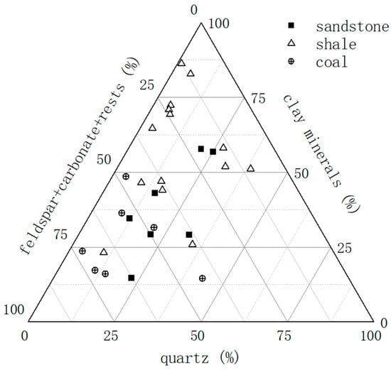 The mineral composition results of the study area measured by the XRD experiment are shown in Figure 3. The sandstone in the study area has a quartz content ranging from 11.9% to 31.9%, with an average of 21.1%. The clay mineral content ranges from 14.8% to 57.9%, with an average of 38.0%. The clay minerals herein mainly include kaolinite, illite, montmorillonite, chlorite, and an illite–montmorillonite interlayer. The combined content of feldspar, carbonate, and other minerals ranges from 18.2% to 62.8%, with an average of 40.9%. The other minerals include limited siderite and pyrite. The quartz content in the mudstone ranges from 1.2% to 38.8%, with an average of 15.0%. The clay mineral content ranges from 23.2% to 86.3%, with an average of 56.7%. The combined content of feldspar, carbonate, and other minerals ranges from 10.1% to 66.5%, with an average of 28.2%. The quartz content in the coal seams ranges from 3.9% to 43.1%, with an average of 15.1%. The clay mineral content ranges from 16.1% to 48.6%, with an average of 26.9%. The combined content of feldspar, carbonate, and other minerals ranges from 42.3% to 72.4%, with an average of 58.0%.