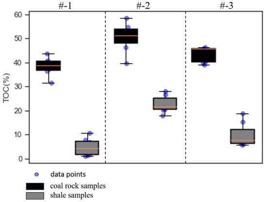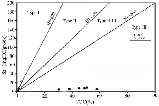 The total organic carbon (TOC) levels of samples collected from the study area exhibited a wide range, spanning from 0.94% to 58.47%, with an average of 22.39%. The TOC levels showed considerable dispersion, as evident from Figure 4. Notably, the coal-bearing rocks displayed higher TOC content, ranging from 31.49% to 58.47%, with an average of 45.91%. In contrast, the shale samples exhibited lower TOC content, varying from 1.2% to 27.92%, with an average of 8.41%. These findings indicate that the coal-bearing rocks in the study area possess a significantly higher TOC content compared to the shale formations. Such variations in TOC content have important implications for hydrocarbon potential and reservoir characterization in the study area. Understanding these differences in organic carbon abundance is crucial for evaluating the source rock’s hydrocarbon generation potential and can aid in identifying favorable areas for further exploration and development.