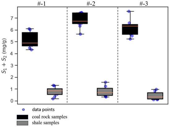 The potential hydrocarbon generation amount (S1 + S2) in the study area exhibited considerable variation. The range spanned from 0.01 to 8.60 mg/g, with an average value of 2.93 mg/g. Notably, a significant majority of the shale samples (approximately 70%) had S1 + S2 values exceeding 2 mg/g, as observed in Figure 5. In contrast, the coal-bearing rocks displayed a higher range of S1 + S2 content, ranging from 4.4612 mg/g to 8.5997 mg/g, with an average of 6.1624 mg/g. Conversely, the shale samples exhibited a relatively lower S1 + S2 content, ranging from 0.1111 mg/g to 0.8474 mg/g, with an average of 0.3229 mg/g. These observations indicate that the coal-bearing rocks in the study area possess a higher potential for hydrocarbon generation compared to the shale formations. This discrepancy can be attributed to the favorable coal formation and preservation environments that facilitate the accumulation of organic matter. The findings contribute to a better understanding of the hydrocarbon potential and resource assessment in the study area, offering valuable insights for future exploration and development strategies.