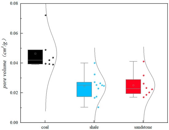 Based on the low-temperature nitrogen adsorption experiment, the pore volume of the coal seam in the study area ranges from 0.039 cm3/g to 0.0722 cm3/g, with an average of 0.0464 cm3/g, while the pore volume of the shale ranges from 0.0104 cm3/g to 0.0401 cm3/g, with an average of 0.0244 cm3/g, and the pore volume of the sandstone ranges from 0.0171 cm3/g to 0.0411 cm3/g, with an average of 0.0251 cm3/g (Figure 7). It can be seen that the coal seam has a relatively large pore volume. This may be due to the lithological characteristics of the coal seam, which has a higher porosity and a more favorable distribution of pores, resulting in a relatively large pore volume. The composition of coal, primarily consisting of organic matter, undergoes complex processes such as compaction, coalification, and thermal maturation during its formation. These processes result in a denser structure and reduced pore volume within the coal matrix. However, coal-bearing rocks contain larger pores, known as macropores, which are formed during coalification and the release of volatile components. These larger pores contribute to the larger average pore diameter observed in coal-bearing rocks.