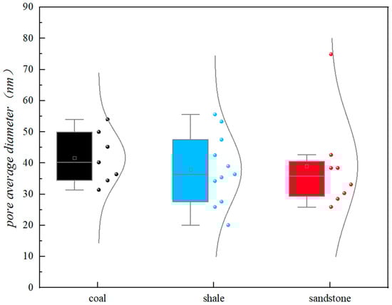 The average pore size of the coal seam in the study area ranges from 31.4 nm to 54 nm, with an average of 41.7 nm, while the average pore size of the shale ranges from 20.1 nm to 55.6 nm, with an average of 38.0 nm, and the average pore size of the sandstone ranges from 25.9 nm to 74.9 nm, with an average of 39.0 nm (Figure 8). This indicates that the average pore size of shale is relatively small. This may be due to the lithological characteristics of shale, which is subjected to long-term compaction and therefore is limited in the formation and preservation of pores, resulting in a relatively small average pore size. It is worth noting that sandstone has a complex pore structure with a large number of multi-level pores, which may lead to a smaller average pore size. Shale and sandstone are predominantly composed of mineral particles such as clay, quartz, and feldspar. These mineral particles form a framework within the rocks, creating intergranular pores and microfractures that contribute to the overall pore volume. However, it is noteworthy that tight sandstone has larger pore sizes compared to shale. This can be attributed to the differences in the sedimentation and diagenetic processes that shape the pore structure of these rocks. Tight sandstone undergoes more significant compaction and cementation, which can result in pore enlargement and the formation of interconnected pore networks. On the other hand, shale is characterized by finer particles and higher clay content, leading to the formation of smaller-sized pores.