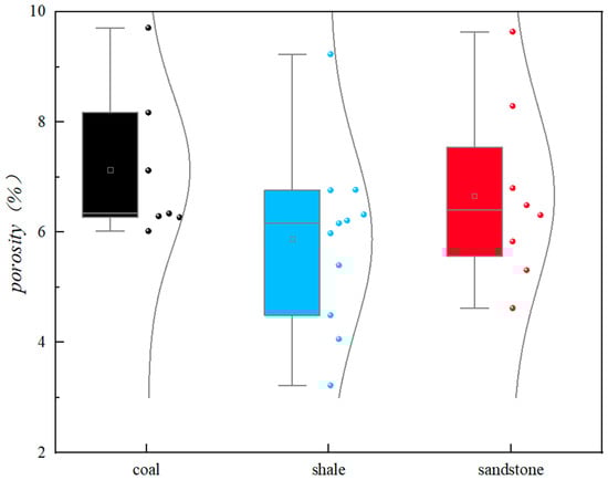 As shown in Figure 9, the porosity of the coal seam in the study area ranges from 6.02% to 8.17%, with an average of 7.13%, while the porosity of the shale ranges from 3.22% to 9.23%, with an average of 5.87%, and the porosity of the sandstone ranges from 4.62% to 9.64%, with an average of 6.66%. It can be seen that the coal seam has a relatively large porosity, while the shale has a relatively small porosity. This may be due to the higher gas content and larger pore structure of the coal seam, resulting in a larger porosity, while the shale is affected by long-term compaction and lithological characteristics, resulting in a smaller porosity.