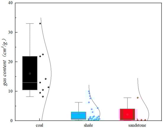 The gas content of the samples was quantified using the methods described in the previous sections. The results, as depicted in Figure 10, revealed a wide range of gas content, ranging from 0.14 cm3/g to 33.04 cm3/g, with an average value of 5.25 cm3/g. Notably, coal-bearing rocks exhibited the highest gas content, followed by shale formations, while tight sandstone samples displayed the lowest gas content. These findings underscore the significant variability in gas content among different lithologies within the study area. The higher gas content observed in coal-bearing rocks indicates their favorable potential as gas reservoirs. Conversely, the lower gas content in tight sandstone suggests limited gas storage capacity. Understanding these variations in gas content is crucial for resource assessment and can guide future exploration and production activities.