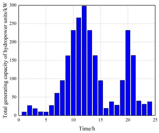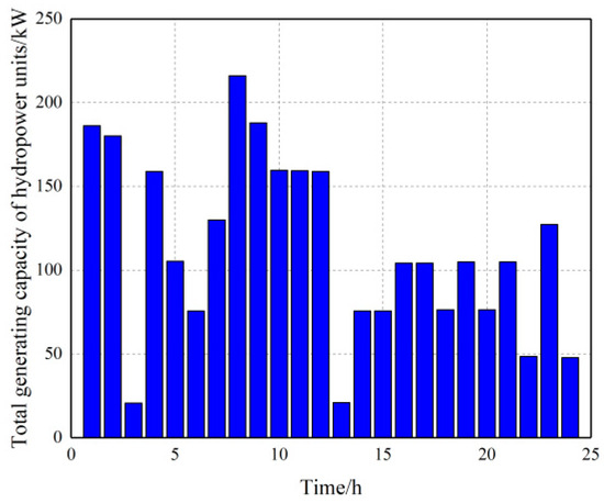 Similarly to the analysis of Scenario 1, from the analysis of the Figure 6, Figure 7, Figure 8 and Figure 9, it can be determined that, based on the curve of the original load and the optimized residual load, the peak-valley difference of the residual load curve is optimized to the minimum. The optimization process can be roughly analyzed based on the characteristics of the original load curve, which involves supplying the load of the two peak periods as much as possible, thereby reducing the peak-valley difference and utilizing the peak-shaving ability of the cascade hydropower stations. According to the total output of the hydropower units, there is a large output from 6:00 to 15:00 and 19:00 to 21:00, consistently with the above analysis. According to the reservoir capacity optimization curve, the system reservoir is storing water from 0:00 to 6:00 and discharging water from 6:00 to 12:00. The reason is that from 6:00, the system faces the first peak load period, and the reservoir needs to coordinate with the hydropower units for discharging water.