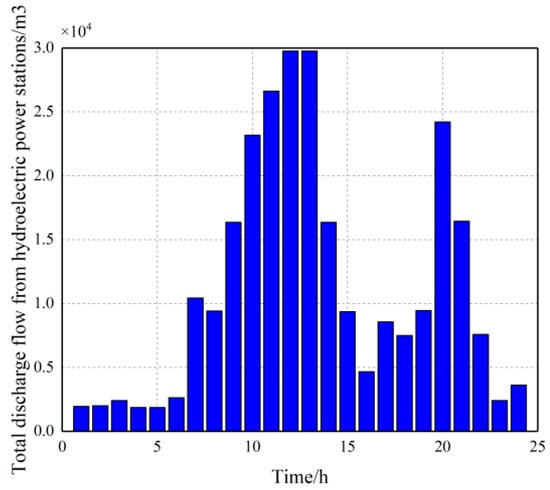 The above formula represents the minimization of the total residual load of the system. is the total time scale of the optimization dispatch, which in this paper is one day; is the total number of hydropower stations; is the load demand in period within a day; is the net water discharge power generation (output) of hydropower station in period.
