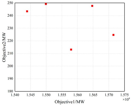 According to the analysis of the Figure 19, when the optimization objective 1 decreases, the optimization objective 2 increases, and this process is nonlinear, indicating that this model does not have an optimal solution but an optimal solution set. At the same time, the magnitudes of the two objective optimization values are different. Changing the weight factors can effectively change their variations, verifying the robustness of the proposed membership degree function multi-objective optimization.