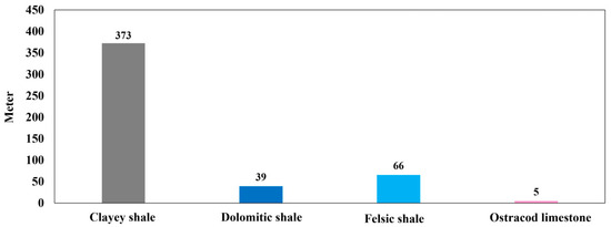 Based on the analyzed target layer of a typical well in the study area, the lithofacies are mostly clayey and felsic, whereas the contents of the dolomitic lithology and ostracod limestone phase are very small (Figure 2). This is mainly due to the fact that K2qn shale is generally in a deep lacustrine to semi-deep lacustrine sedimentary environment, and the terrigenous clastic supply is relatively insufficient [1,2,3], so the lithofacies dominated by felsic shale is rarely developed. At the same time, because the deposition period of K2qn shale is only a short shoreline shallow lake period, the overall size of the ostracod limestone facies is very small, and the content proportion is low.