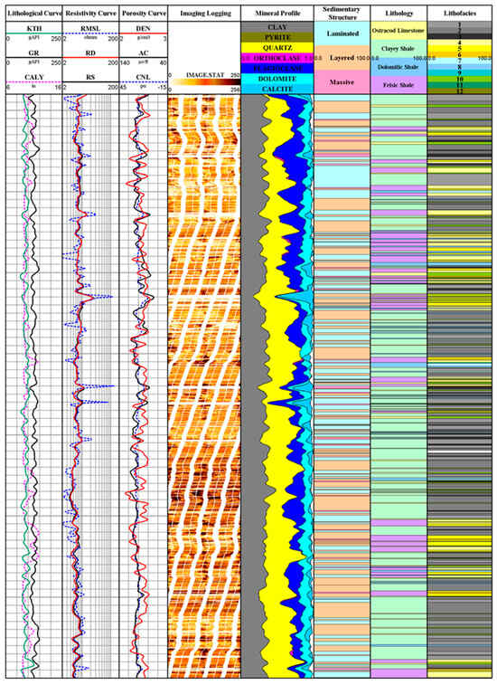 Through the optimization calculation method of litho scanner logging, the longitudinal continuous quantitative characterization of mineral composition was achieved. The results show that the variation of lithology and lithofacies in the K2qn shale reservoir of the Gulong Depression is rapid in the vertical direction, and the heterogeneity of the reservoir is strong, mainly consisting of felsic shale and ostracod limestone (Figure 1). Regarding clayey shale, conventional logging shows a high gamma value (GR), a low density (DEN), and a high acoustic travel time (AC). Litho scanner logging shows low Mg and Ca values, high clay mineral content, relatively low felsic content, and low carbonate mineral content. Imaging logging shows a banded pattern, and stratification can be seen where lamina developed. Regarding felsic shale, conventional logging shows a low density (DEN), a low acoustic travel time (AC), and low neutron (CNL). Litho scanner logging shows high Ca and Mg values and high iron dolomite content. Imaging logging shows a blocky, linear, or banded pattern. Regarding ostracod limestone, conventional logging shows a high gamma value (GR), high resistivity (RMSL), a high density (DEN), and a low acoustic travel time (AC). Litho scanner logging shows a high Ca value and high calcite content. Imaging logging shows a bright blocky or banded pattern. Regarding dolomitic shale, conventional logging shows a low density (DEN) and an acoustic (AC) lag. The imaging logging results show that the Ca and Mg values are high, and the content of ferrodolomite is high. The imaging logs show blocky, linear, or banded patterns (Figure 2).