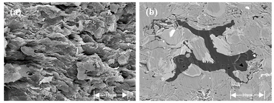 Microscopic characteristics of clay mineral lamination of Gulong shale. ((a) bedding fractures between sheet clay minerals; (b) bedding fractures between sheet clay minerals).