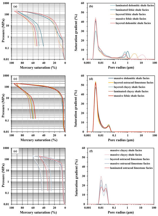 The mercury injection curves and characteristic of their pore radius of K2qn formation in the Gulong Depression. ((a,c,e) mercury injection and removal curves of different facies; (b,d,f) pore size distribution of different facies).