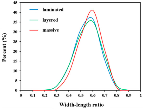 In addition, when using the aspect ratio to characterize pore types, a value of 1 approximately represents spherical pores, a value of less than or equal to 0.5 represents elongated fracture-type pores, and a value between 1 and 0.5 represents elliptical spherical pores. The results show that there is a significant relationship between the pore shape and sedimentary structural pattern in the K2qn shale. The layered sedimentary structure has the largest pore aspect ratio, and the layered sedimentary structure is intermediate, while the layered sedimentary structure has the smallest pore aspect ratio. The different pore shapes have different closing stress, resulting in the non-uniform deformation and pore closure occur. Compared to elliptical or circular pores, elongated fracture-type pores will close at very low stress, while spherical pores require higher stress to close completely (Figure 8). Therefore, under the same compressive stress conditions, the layered sedimentary shale will experience the most pore closure, causing changes in pore neck size and distribution, while the elliptical spherical pores with high aspect ratios in massive lithofacies maintain good pore neck connectivity.