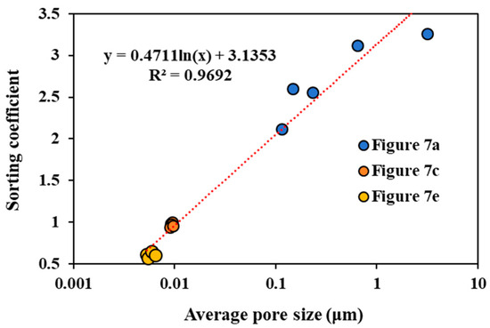 As shown in Figure 9, with the increase in the average pore size, the corresponding sorting coefficient increases. According to Figure 7 and Figure 9, the laminated dolomitic shale facies, layered dolomitic shale facies, laminated felsic shale facies, layered felsic shale facies, and massive felsic shale facies have large average pore sizes. The massive felsic shale facies, massive dolomitic shale facies, laminated clayey shale facies, layered clayey shale facies, and layered ostracod limestone facies have a median pore size distribution. In contrast, the average pore sizes of the laminated ostracod limestone facies, layered ostracod limestone facies, massive ostracod limestone facies, and massive clayey shale facies are the smallest.