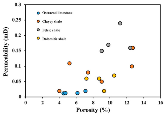 In general, the impact of the relative physical properties of K2qn shale is essentially caused by changes in the sedimentary environment, and the difference in the physical properties of different types of lithofacies is directly related to the sedimentary environment during the formation of lithofacies. The felsic lithofacies in the study area are mostly formed in the shoreline shallow lake environment close to the source area [8,17,18], and the deposition rate is fast. Under the frequent change in the lake plane, the thickness and physical properties of felsic laminae are easy to increase. Clayey shale facies are basically developed in a semi-deep lake sedimentary environment with low energy and still water, and the sedimentary structure is mainly layered and laminated, and the minerals are mainly a micrite structure. Thus, when the clayey shale lithofacies formed, their permeability and porosity were low. However, the laminated clay mineral interlayer fractures formed in the later diagenetic process can improve the physical properties. The ostracod limestone lithofacies sedimentary area is usually located in the still water environment under the wave base in the lake basin, belonging to the shallow carbonate rock ring near the normal wave base to the mean low tide line. The water energy in this sedimentary environment is low, and since the small influence of the wave movement, water flow, and sediment flow is slow, the ostracod limestone can be formed here [15,17,19,20]. The calcite minerals are mainly a micrite structure. Due to the lack of stratification and exposure modification, the physical properties of ostracod limestone lithofacies are generally the lowest in this environment. The dolomitic lithofacies usually develop above the normal wave base in the lake basin. Its environmental hydrodynamic conditions are strong, and the wave disturbance is relatively developed. If the top is reformed by atmospheric fresh water, the reservoir physical properties can be effectively increased, and the physical properties are superior to those of the ostracod limestone lithofacies.