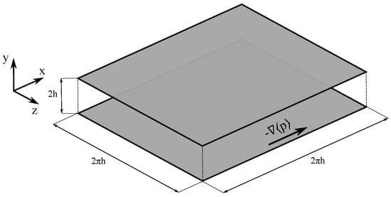 We investigate the isothermal turbulent flow in the plane channel, i.e., the flow between two infinite, flat, and parallel walls driven by a uniform mean pressure gradient, . The x, y, and z axes correspond to the streamwise, wall-normal, and spanwise directions, respectively, as shown in Figure 1.