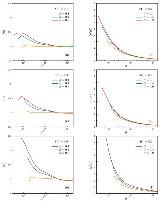 In order to analyze the effect of the added-mass factor on particle spatial distribution, we study the statistics of the particle number density n, i.e., the number of particles per unit volume, which in the following will be implicitly rescaled with the mean concentration of particles in the channel (which, in dimensionless form, is equal to ). The time-averaged particle concentration, , and its variance, , are shown in Figure 2, plotted against for various . Particle concentration profiles reveal that heavier particles, characterized by and , exhibit a notable tendency to accumulate very close to the walls. Furthermore, the concentration peak occurring in the viscous sublayer () strengthens with higher Stokes numbers. This observation aligns with previous findings described in the literature [14,23,24], confirming that particle drift toward the walls is more pronounced as the particle response times approach the viscous timescale of the flow. Interestingly, as the added-mass factor increases, particles exhibit a progressive shift toward a more uniform spatial distribution. Regardless of the Stokes number, concentration profiles flatten out around the mean value (yellow lines in Figure 2a,c,e), and the concentration variance consistently decreases, even if the wall regions still keep a much higher variance than the channel center.