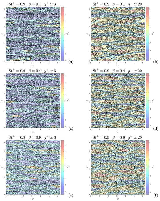 Visualizations of the instantaneous position of particles (shown out of scale), superimposed on the fluid streamwise velocity fluctuations, , in the wall-parallel planes at (a,c,e) and (b,d,f) at for and different added-mass factors . The particles shown in the left column are those contained between the wall-parallel planes at and , while the particles in the right column are those contained between the planes at and .