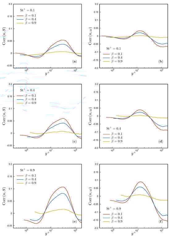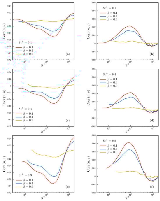(a,c,e) Correlation coefficient between particle concentration, n, and the streamwise velocity, u, as a function of . (b,d,f) Correlation coefficient between particle concentration and the wall-normal velocity, v, as a function of . Both correlations are shown for different Stokes numbers: (a,b), (c,d), and (e,f).