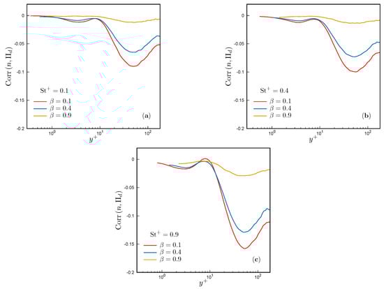 These correlation profiles indicate that in the buffer layer (), the concentration of heavier particles ( and ) correlates with negative values of streamwise velocity fluctuations and positive values of wall-normal velocity fluctuations. This result suggests that heavier particles tend to collect and dwell longer in low-speed streaks near the wall, as negative values of and positive values of are distinctive features of these flow structures, which are generated and lifted away from the wall by the most energetic streamwise vortices occurring in the buffer layer [39]. The peaks of the red and blue curves in Figure 4, corresponding to and , respectively, become more pronounced as the Stokes number increases, indicating that preferential concentration in low-speed streaks is more intense as particle response time approaches the viscous timescale, as observed in previous studies [14,23,24]. In clear contrast is the influence of the added-mass factor. Indeed, with an increase in , the concentration of particles gradually decorrelates from both the streamwise and wall-normal velocity components of the fluid. These results are consistent with the findings on the redistributive effect of on particles presented in the previous section and suggest that the centrifugal mechanism, primarily responsible for turbophoresis at the relatively small Stokes numbers considered, weakens as particle mass density decreases, regardless of the Stokes number. This result can be expected by considering that the pressure-gradient force is directed toward the centers of vortices, where pressure is expected to have a local minimum, and is proportional to the fluid density. Since particles with have a mass density only 1.17 times greater than the density of the fluid, this force is able to almost balance the centrifugal effect, proportional to the particle density, so that in such conditions, particles tend to behave almost like spherical and rigid fluid particles. Consequently, even if their velocity field is not solenoidal, and a weak clustering is still possible, these particles are able to closely trace the carrier flow.