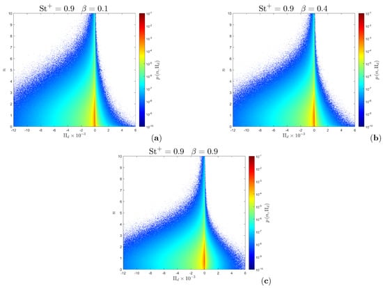 We conclude our analysis with the investigation of the influence of on the Joint Probability Mass Function (Joint-PMF) characterizing the relationship between particle concentration and the second invariant of the velocity gradient tensor () across the entire computational domain. While the Joint-PMF has been calculated for each simulation, for the sake of clarity and to highlight the role of the added-mass factor, we present, in Figure 7, specific instances corresponding to a single Stokes number (). The peaks in the Joint Probability Mass Function (Joint-PMF) at can be attributed to the inherent characteristic of the second invariant of the velocity gradient tensor, which consistently assumes a zero value for the mean flow. Consequently, zero emerges as the most probable outcome for the instantaneous realizations of . Notably, irrespective of the added-mass factor, all Joint-PMFs exhibit an asymmetric distribution around , which distinctly protrudes towards negative values of . This observation implies that both heavier and lighter particles are more likely to be found in regions characterized by negative , where strain dominates over vorticity. However, as the added-mass factor grows, the lobe of the Join-PMFs shrinks, while higher values of joint probability between n and gradually populate the positive semi-axis of , as evident from Figure 7b,c. Consistent with prior observations regarding the role of in decorrelating particle concentration from the local flow topology, this outcome indicates that lighter particles exhibit a comparable likelihood of being found in regions characterized by high vorticity as they do in those dominated by strain.