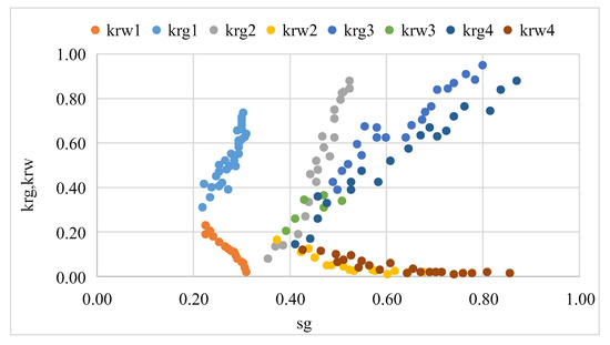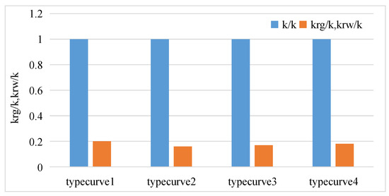 Gas–water two phase seepage is mainly manifested by the changes in the relative permeability of the liquid and gas phases in reservoirs with different gas saturation levels. Because a coal reservoir is considered as a kind of reservoir with relatively developed fractures, the phase permeability curve of coalbed methane is usually of the “X” type at present. However, through testing the phase permeability curve of a coal reservoir, it is considered that the phase permeability curve of a coal reservoir is consistent with that of a porous medium reservoir [24] (Figure 1); the gas phase permeability and water phase permeability near the isotonic point can drop to 0.2 times the absolute permeability, and the seepage efficiency in the reservoir is greatly reduced (Figure 2). Therefore, the phase permeability curve can be used to characterize the influence of gas–water two phase flow on reservoir seepage capacity.