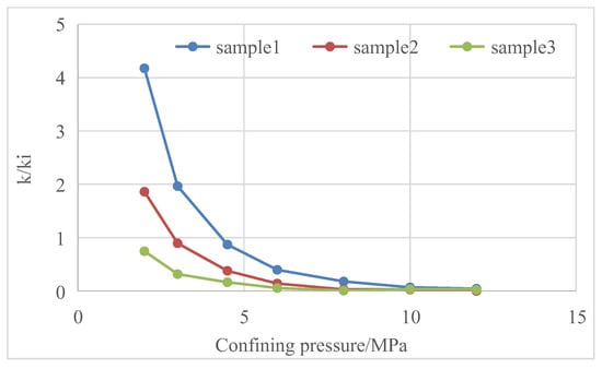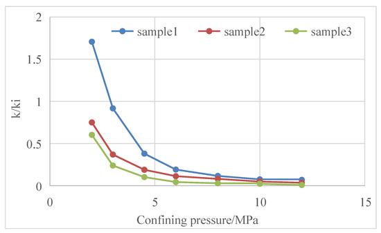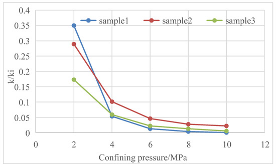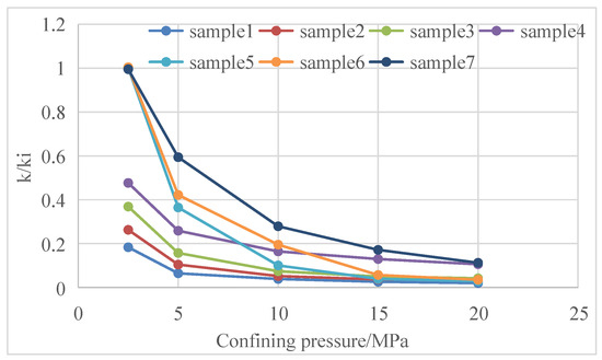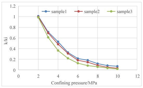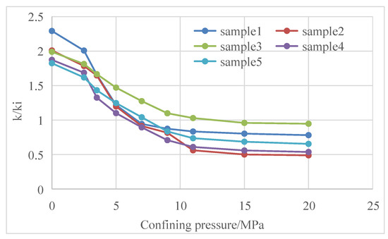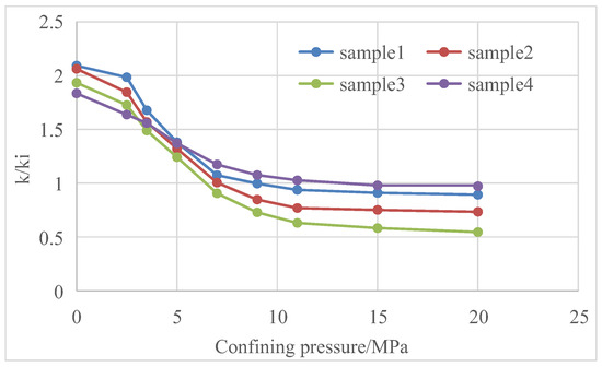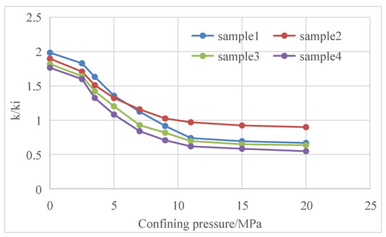 Both reservoir stress sensitivity and matrix shrinkage effects show that reservoir permeability changes with the change in reservoir fracturing [25,26,27]. Core tests have tested the changes in core permeability with confining pressure in Baode block on the eastern edge of Ordos Basin, Mabi block in the southern part of Qinshui Basin, Zhengzhuang block and Fanzhuang block in the southern part of Qinshui Basin and Qilihe block in the northern part of Qinshui Basin [28,29,30] (Figure 11, Figure 12, Figure 13, Figure 14, Figure 15, Figure 16, Figure 17 and Figure 18).